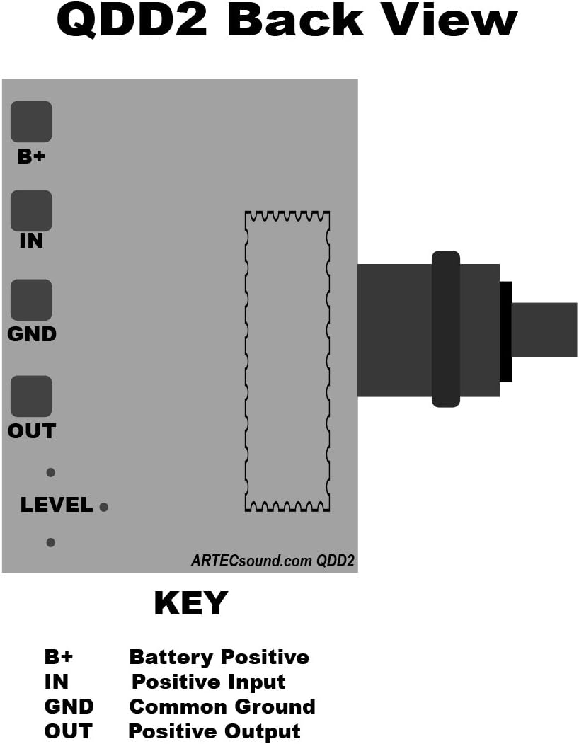 This is the Artec QDD2 Quadra Distortion Driver board, a great little component that allows you to add great distortion effects directly to your guitar or amplifier, including cigar box guitars and amps! This board has a 5-position selector pot built in, with "true bypass" and then four levels of distortion effects. This circuit has been built to simulate classic "overdrive"-style tones, and it is like having four of the best known overdrive pedal and tube amp tones built right into your guitar or amp! This board is powered by a 9-volt battery, and the battery connector is included (though the battery is not!). An onboard trim pot allows you to adjust the gain - you can even pop this off and wire in a panel-mount gain pot if you want for even more control! Please see the board diagram and wiring diagram photos for an idea of how to wire up this board. We include a 2-page guide with each of these boards to help you get going on getting it wired up. Please note that if you are building this board into an amplifier, it should go BEFORE the amp circuit, as shown in the wiring diagram. These work fine with our Artec SDA-T amp boards, but you should be aware that in our testing Position 5/Heavy Metal on this board is just too much for the SDA-T amp board and isn't really usable. However, the other 3 effects sound great! Also note that in our testing, trying to use the same 9-volt battery for both this board and the SDA-T board yielded feedback and other noise, so we recommend having two separate batteries for the two boards.
