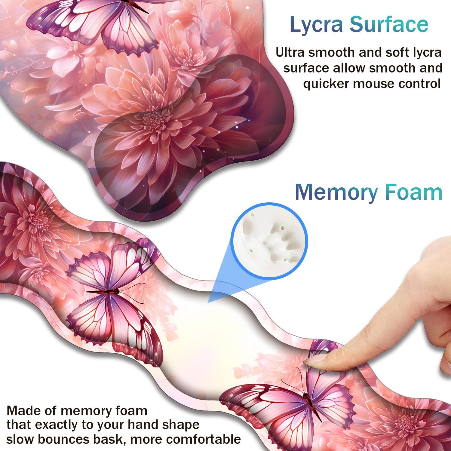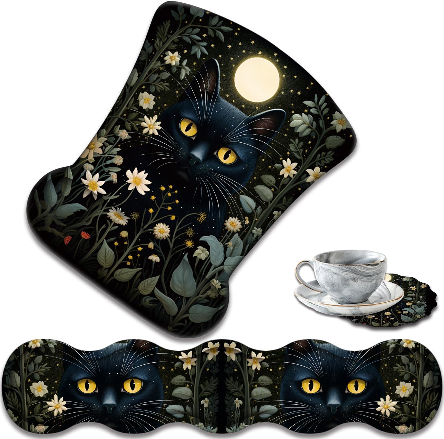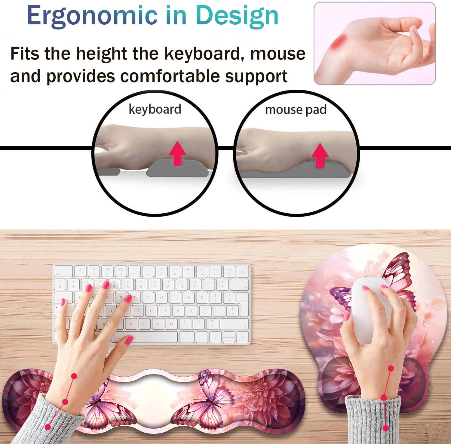Ergonomic Mouse Pad with Wrist Rest + Keyboard Wrist Rest + Coaster Set, a great gift for work or playing computer games.Soft wrist rest is designed to fit the wrist perfectly, reducing the pressure on the wrist and helping to avoid joint and wrist problems.Feature:-- Protect wrist joints and reduce wrist fatigue and pain caused by prolonged use of keyboard and mouse.-- Natural rubber material and Lycra super smooth surface, make your mouse movement more accurate.-- The non-slip PU rubber sole firmly grips the desktop, not easy to move, so you can use it with confidence.-- Keyboard wrist rest support and wrist rest mouse pad have reinforced edges to prevent deformation or damage and have a long service life.-- The product comes with beautiful illustrations to ensure no fading or bleeding. An ideal gift for family, friends, colleagues and more.Product Specifications:Material: Comfort Gel, Non-Slip PU Base and LycraWrist Padding Material: Memory FormProduct Dimensions: Keyboard Wrist Rest (17.35 x 3.55 x 0.98 inches); Mouse Pad Wrist Rest (9.84 x 8.66 x 0.98 inches); Coaster (3.93 x 3.93 inches)Package Included:1 × Mouse Pad Wrist Rest;1 × Keyboard Wrist Rest;1 × CoasterService:Order an ergonomic keyboard and mouse wrist pad now to say goodbye to uncomfortable and painful typing. If you have any questions or concerns about the product, please contact us, we are ready to help you.