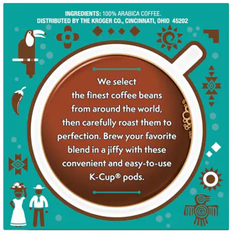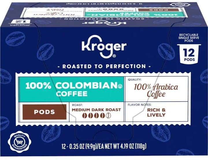 ONE Small Box of Kroger ☕️ Medium Dark Roast ‘Rich & Lively’ 🇨🇴 100% Colombian Arabica Coffee ⛰️ K-Cups ☕️ 12-Count Recyclable Pods ♻️ 4.19 Ounces (118 Grams) 📦 1 Pack 🇺🇸. One box contains 12 servings; each K-Cup is to be brewed for one single-serve cup of coffee. "We select the finest coffee beans from around the world, then carefully roast them to perfection. Brew your favorite blend in a jiffy with these convenient and easy-to-use K-Cup pods. (Keurig Brewed, for use in all Keurig K-Cup Brewers, but not for Keurig Vue Brewing Systems.)" Preferred seller is all_sufficiency. [New UPC #011110117724 replaces old 011110856654.] ALL SALES FINAL – No Returns – No Refunds – No Price-Matching. Enjoy :) ☕️ 🇨🇴 🌎 ⛰️ 🌴 🌱 👨🏽🌾 🦙 🐴 ☀️ ☁️ 🦎 ,🌶️ 🦜 ♻️♲♼ 📦 🇺🇸