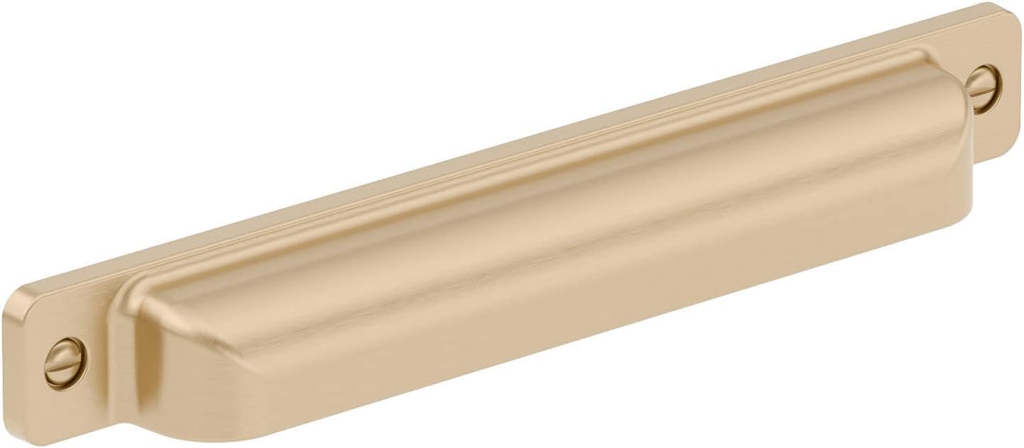 Transitional rectangular cup pull with faux screw embellishments. Please note that the screws included with the products are a standard size of 1 in (25 mm) length, quadrex, pan head. They will fit with most of the popular melamine thicknesses, which range between 5/8 in to 3/4 in (16 mm to 19 mm).