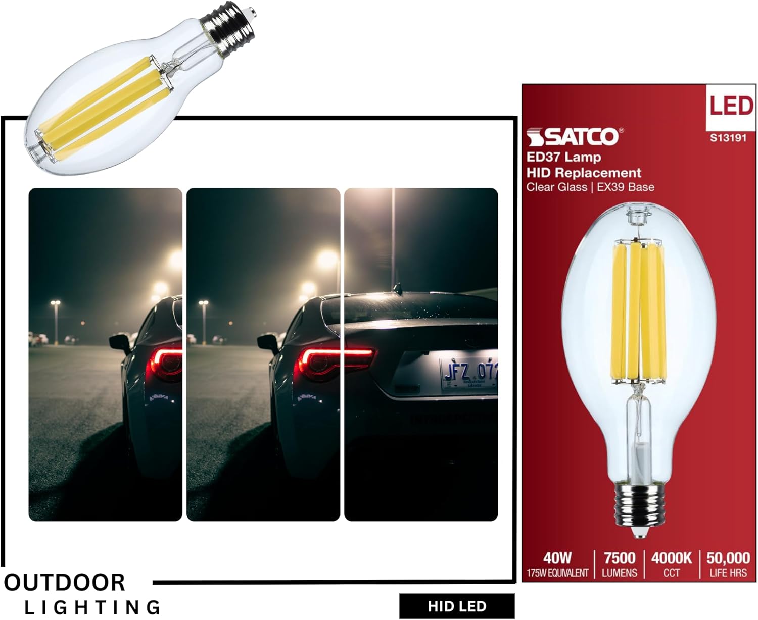 The Satco S13191 40W LED HID replacement bulb is an advanced lighting solution designed for industrial and commercial applications. Emitting a crisp 4000K cool white light, this LED bulb delivers an impressive 7500 lumens of brightness, ensuring powerful illumination for warehouses, parking structures, high bays, and security lighting. Its clear finish maximizes light output, providing bright, consistent illumination while significantly reducing energy consumption. Designed with an EX39 mogul extended base, this LED bulb seamlessly integrates into existing HID fixtures, making retrofits quick and efficient. The ballast bypass design eliminates the need for outdated components, increasing efficiency and reducing maintenance costs. With an 80+ CRI rating, this LED ensures improved color accuracy, enhancing visibility and safety in commercial and industrial environments. The universal 120-277V operation makes it adaptable for a wide range of electrical systems. Built to last, the Satco S13191 LED replacement bulb boasts a lifespan of up to 50,000 hours, reducing maintenance frequency and replacement expenses. Engineered for enclosed fixtures and damp locations, it offers long-term reliability in demanding environments. Whether used for security lighting, industrial applications, or commercial floodlights, this LED upgrade provides consistent brightness while cutting energy costs for businesses and property managers.